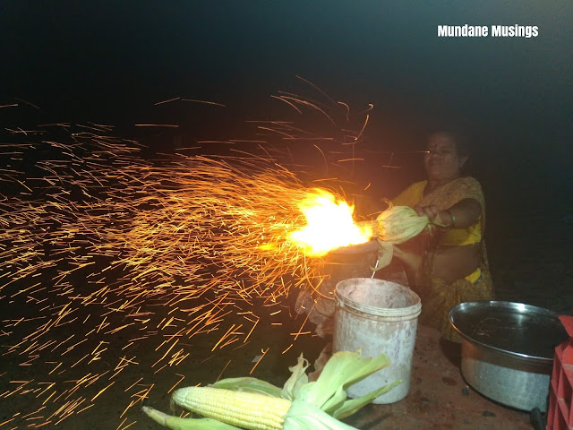 The sparks coming off spiritedly from the nearby roasted corn on the cob woman's stall was too tempting to miss. At Rs. 20/- per corn it delivered the message that I was getting older loud and clear. I couldn't help remembering the times when we have paid less that Rs. 5/- for the same and those were for the nutty tasting, hard Indian kernels. Now it is just American corn everywhere and I must say they are easy on the teeth though heavier on the pocket. ;)
